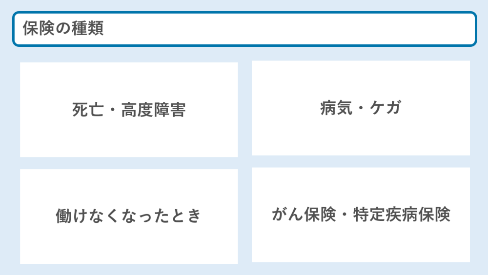 先ず保険の種類は大きく大別して4つあります。それぞれ社会保険にて国から保障もありますので、必要度合いに応じて加入しましょう。