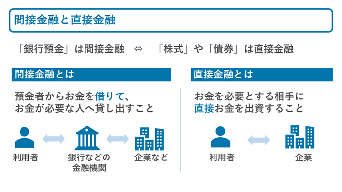まずは、お金の基本となる「間接金融」と「直接金融」の違いについて理解しましょう。金融商品には、第三者からお金を借りて間接的に必要な人に貸し出す「間接金融」と、お金を必要とする人に直接出資する「直接金融」の2種類があります。間接金融の代表例は、「銀行預金」です。銀行にお金を預けるというのは、銀行側から見るとお金を預金者から借りるということになります。銀行は預金者からお金を借り、必要な人に貸し出しているため、間接金融と呼ばれています。直接金融の代表例は、株式や債権です。株式や債権の取引には必ず証券会社を通すことにはなりますが、お金を出す人とお金を受け取る企業が直接結びついていることから、直接金融に分類されます。