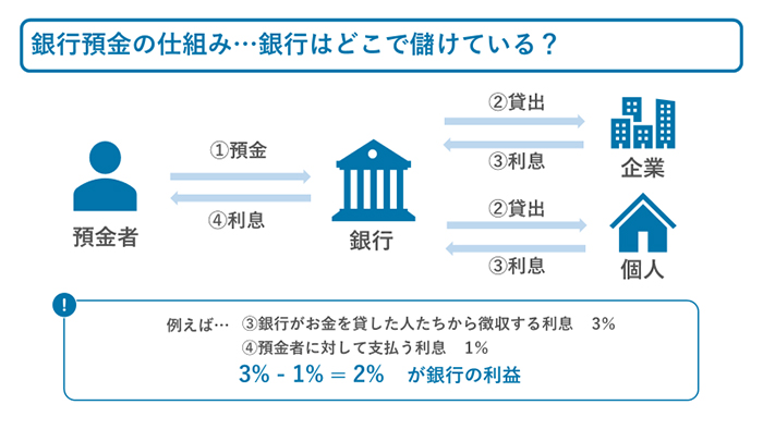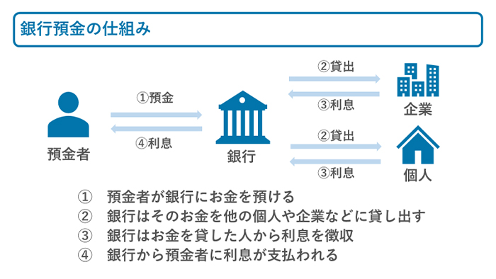 次は、銀行預金の仕組みについてみていきましょう。銀行は預金者から預かったお金を、ただ保管しているわけではありません。個人や企業などお金を必要としている人に貸し出し、返済時に利息を徴収します。銀行は、利息の一部を預金者にお金を貸してくれたお礼として還元することで、銀行預金は成り立っているのです。