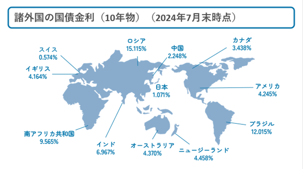 超低金利状態が長期間続いているのでは、日本だけなのでしょうか?先進国から新興国まで、2024年7月末時点における諸外国の10年物国債金利は下記のとおりです。