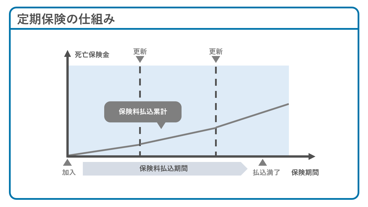 定期保険の場合、契約更新時の年齢で保険料が再計算されます。一方、終身保険の場合は「更新」という概念がありません。