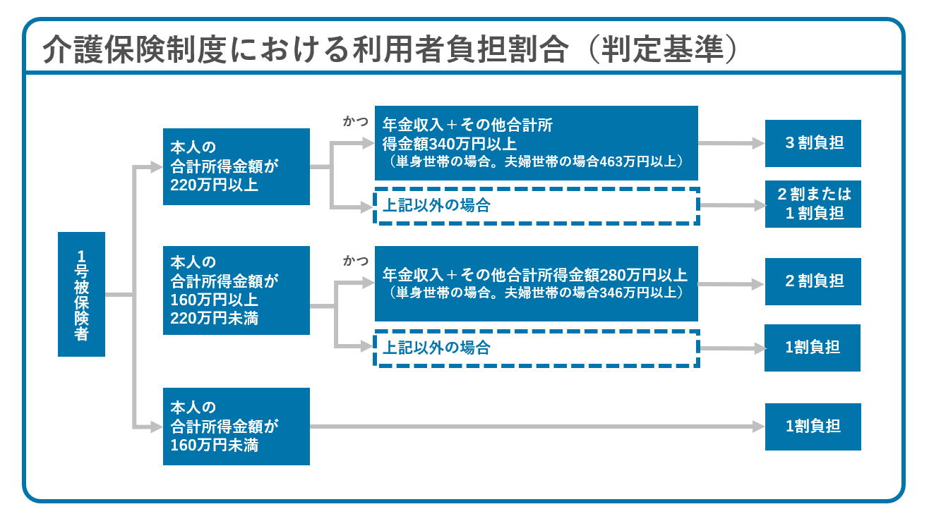 本人の合計所得が160万円未満なら1割負担です。また、合計所得が160万円以上、220万円以下ということなら、年金収入とその他合計所得が280万円未満(夫婦世帯は346万円未満)なら自己負担1割で介護サービスを利用できます。