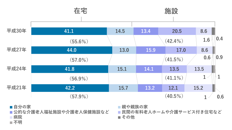 自分の家 親や親族の家 在宅 公的介護老人施設や介護老人保健施設など 民間の有料老人ホームや介護サービス付き住宅など 病院 施設 その他 不明