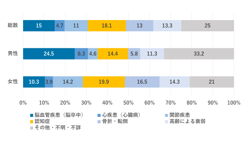 上記の厚生労働省の調査によると、要介護状態となった理由として認知症が大きな理由のひとつとなっていることがわかります。特に女性は19.9%と非常に大きな割合を占めています。一方で関節症や心疾患、高齢による衰弱など様々な理由で要介護状態となっています。