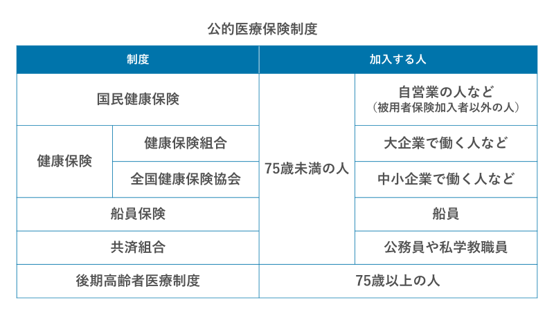 公的医療保険は、大きく分けて3つに分類され、自営業者などが加入する国民健康保険と会社員や公務員などが加入する健康保険、原則75歳以上の人が加入する後期高齢者医療制度があります。