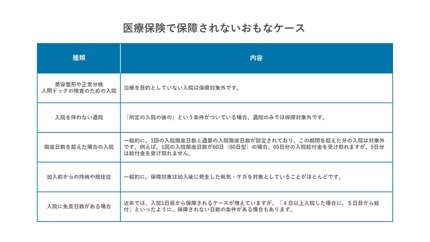病気やケガで入院や手術をした際に保険金額が支払われる医療保険ですが、保険期間中でも保障されないケースや、そもそも加入できないケースがあります。どのような場合に起こりうるのか確認しておきましょう。