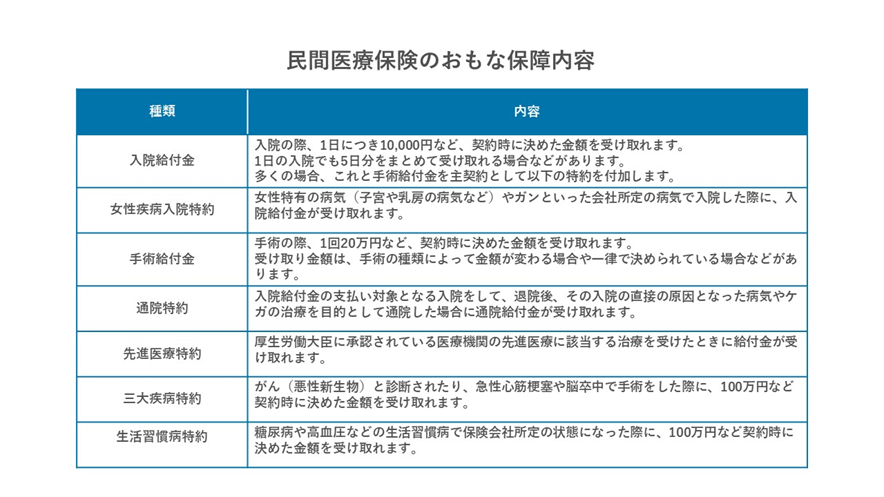 民間の医療保険の保障内容は、保険会社や商品によってさまざまですが、多くの場合「入院」と「手術」の保障が「主契約」と呼ばれる、契約の基本部分となります。