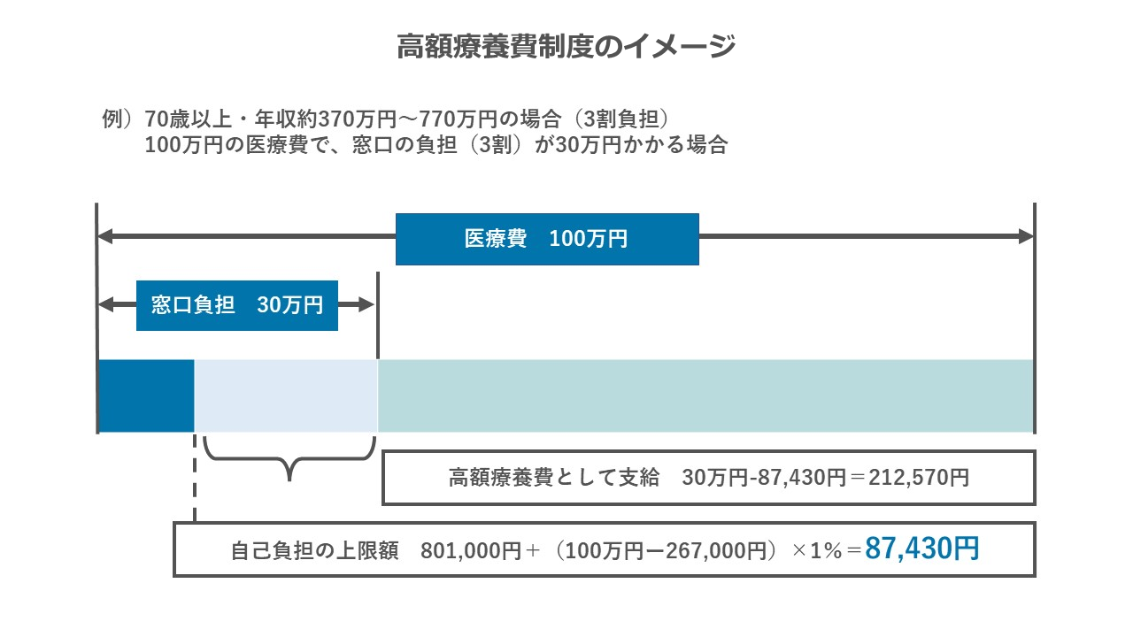 例えば、年収約370万円~約770万円の区分の場合は、「80,100円+(総医療費-267,000円)×1%」が自己負担限度額となります。
